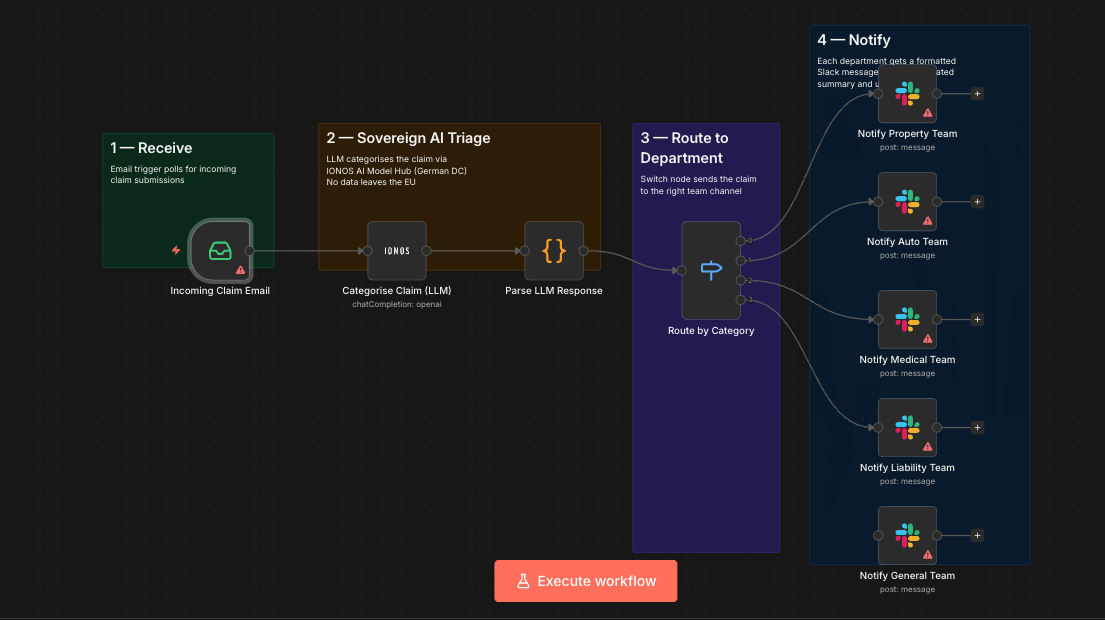 Mit unserer n8n-Integration sieht dieser Workflow entscheidend anders aus: Ein E-Mail-Trigger empfängt den Schaden, die AI Model Hub-Node sendet ihn an ein Open-Source-LLM in einem deutschen Rechenzentrum, und das Ergebnis wird über eine IF-Node direkt an den entsprechenden Team-Kanal in Slack oder Teams geleitet. Der Datenschutzbeauftragte kann nun auf eine Infrastruktur verweisen, die vollständig innerhalb der eigenen Jurisdiktion liegt und von einem europäischen Unternehmen betrieben wird, ohne dass Daten für ein Modelltraining verwendet werden. Das Gespräch verlagert sich schlagartig von „Dürfen wir das überhaupt?“ zu „Wie schnell können wir starten?“.